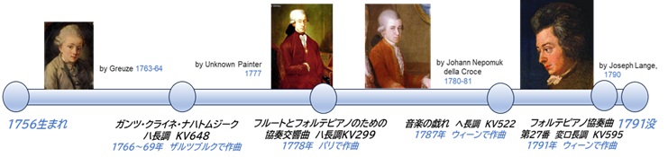 W.A.モーツァルト(1756-1791)は、オーストリアのザルツブルクで生まれ、幼少から父親レオポルトの英才教育と欧州各地の音楽先進地への音楽旅行を通じて演奏と作曲の才能を開花させ、30余年の短い生涯に多種多様なジャンルに多くの名曲を残しました。16歳の時にザルツブルクの宮廷楽団に就職しましたが、その後も就職活動を兼ねてマンハイム、パリなど欧州の都市への旅行を重ねました。25歳でザルツブルクの司教と決別し、ウィーンへ移りフリーランスの音楽家として教師、演奏、作曲と幅広く活躍。30歳で皇帝ヨゼフ二世により宮廷作曲家に任じられ、1791年に亡くなるまで、活発な活動を続けました。(本日の演奏曲と作曲の順序は以下の通りです)